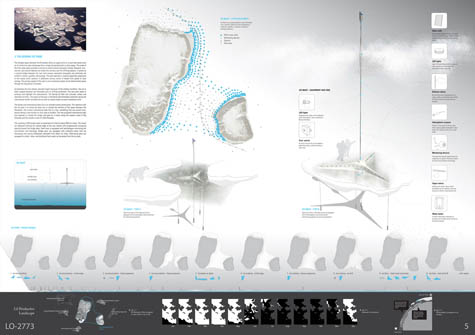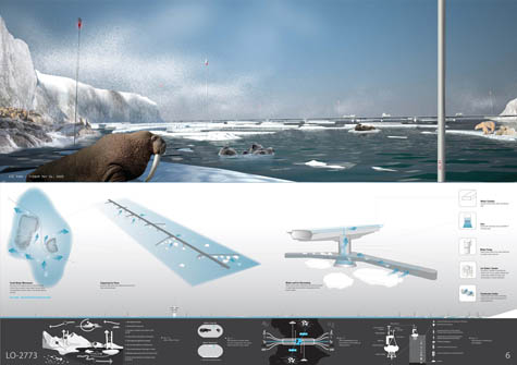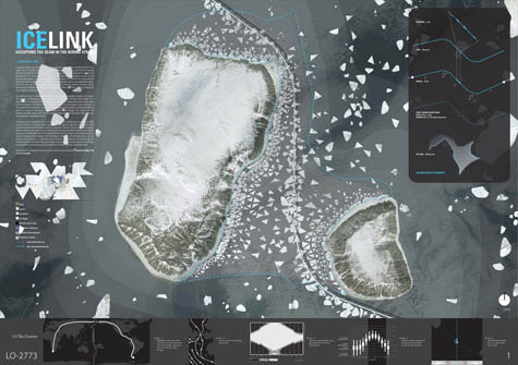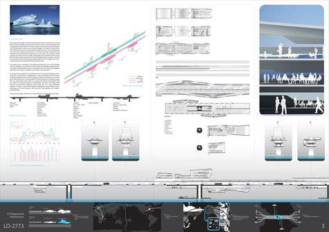 In response to this, then, Lateral proposed: “1) a tunnel/bridge hybrid that runs along the international date line and accumulates diplomatic programs, and 2) a seasonal ice park that harvests ice floes into a global water vault.”