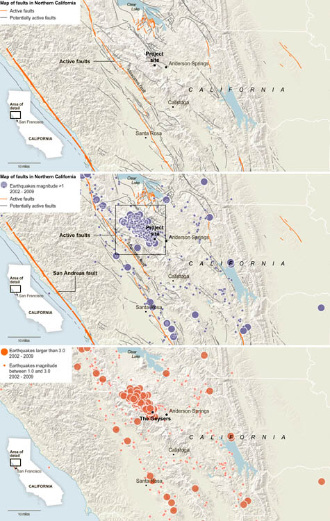 So the scene this time is the countryside two hours north of San Francisco, with a company called AltaRock. “Residents of the region, which straddles Lake and Sonoma Counties,” we read, “have already been protesting swarms of smaller earthquakes set off by a less geologically invasive set of energy projects there. AltaRock officials said that they chose the spot in part because the history of mostly small quakes reassured them that the risks were limited.”