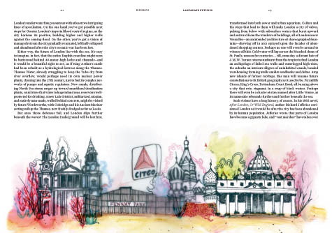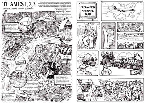 2) For years now I’ve suggested that architectural ideas can be articulated, often extraordinarily well, in the form of graphic novels and comic books – so it seemed like I should finally try that theory out for myself. The book thus comes with two original comic strips, created in collaboration with San Francisco-based illustrator Joe Alterio: “Thames 1, 2, 3” and “Excavation National Park.” They’re featured on the inside covers, one of them without words, the other a much longer scenario in which most of London is underwater, transformed into “an archipelago of flood walls and island fortresses.” There are Conradian references and tide-energy machines.