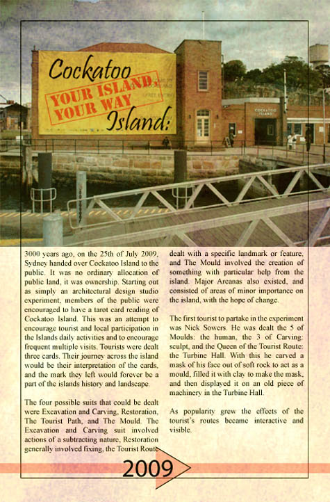 Because of the nature of the studio itself – which was based around the idea of random program generation through the design and distribution of Cockatoo Island-themed “Tarot” cards – this would take the specific form of tourists being handed a series of cards upon arrival at the island.