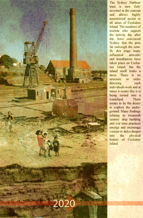 Piecing together found imagery to create his own narrative exploration of Cockatoo Island, Sean addressed the following question: What would happen to the island if it was no longer historically preserved but deliberately, often violently, altered by the tourists who came to visit it?