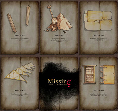 [Images: Building Cards from Tristan Davison’s Missing: Cockatoo Island Edition, produced in less than one week].