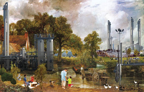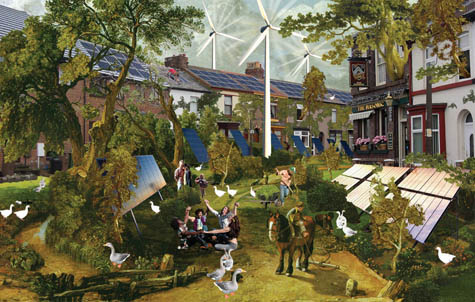 The entire suite of images is almost farcically green – it’s sustainability redone as Grand Guignol. These speculative scenes of “a green future” show us an over-the-top, solar-powered utopia of detached single-family houses and wind turbines, woven together with light rail and renewable energy technologies; it’s an Eden of sprawl spreading out into London’s most distant scattered cityscape.
