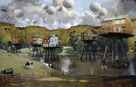 Unexpectedly apropos of the previous post, Liam Young of Tomorrow’s Thoughts Today, together with Darryl Chen, has created a series of quite beautiful images called “Postcards from a Green Future” – one of which, seen above, uses the Maunsell Sea Forts as a gantried foundation for suburban anti-flood design in an idyllic southeast England.
