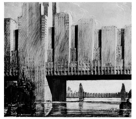 [Image: “Skyscraper Bridges” by Raymond Hood (1929), as seen in the project PDF for Rael San Fratello‘s Bay Line].