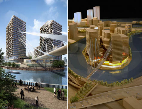 [Image: A proposal for London’s Leamouth Peninsula by Skidmore, Owings & Merrill].