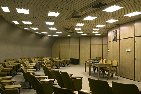 Of course, it would be wrong to over-blur these contexts and ignore the clear, functional purpose of a nuclear bunker; but it’s hard not to wonder about the psychological implications of living underground for extended periods of time or, indeed, what strange impulses might compel a society to seek refuge beneath the surface of the earth—Hinterreiter’s “automatic seclusion from the outside world”—in the first place. This is what BLDGBLOG has previously referred to as “psychology at depth.”