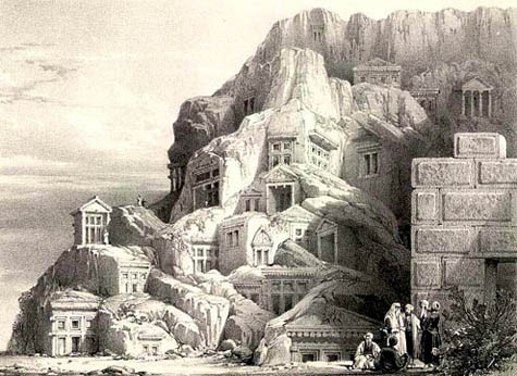 A few miles before we arrived at the termination of the ravine, several remains of Greek-built towers rose from amidst the trees, on the points of rocks, apparently inaccessible; and at the opening of the ravine commenced the cutting of an aqueduct in the face of the perpendicular cliff, which we traced on our right hand to the ancient city. In following its now broken course, numbers of highly ornamented tombs caught my eye, and promised full occupation for a day or two’s sojourn amongst them.