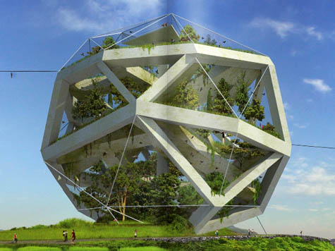 These are major photo manipulations. The first one just screams tension to me. It looks like a triangular ball with all sorts of trees and shrubs within. I cant really tell if the think white lines are supposed to express that there is glass there. If so that one very artistic and abstract green house.