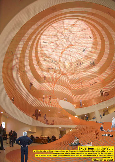 The book includes a huge range of projects, including the DoChoDo Zoological Island proposal, pictured at the head of the post, and “Experiencing the Void,” De Smedt’s proposal for the Guggenheim Museum in New York City in which a massive, climbable web would be hung down through the central rotunda.
