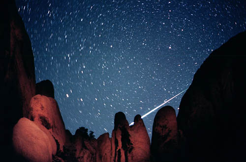 [Image: Perseids Meteor Shower, August 11, 1999; photo by Wally Pacholka, courtesy of NASA].