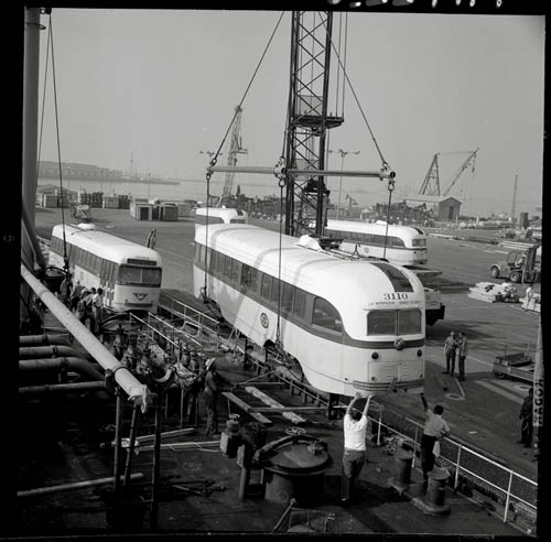 The above image, originally published by the L.A. Times in 1965 and now in a collection at UCLA, shows “electric streetcars that once carried passengers on Los Angeles streets” being loaded by crane onto “the Liberian ship Santa Helena at Long Beach Harbor.” The boat soon thereafter set sail for Cairo, Egypt, as the streetcars had been purchased by that city’s own Transportation Co. “The streetcars will be used,” the caption adds, “in Alexandria, Egypt.” So, like something out of a story by Ignacio Padilla, if you want to experience a lost chapter in Los Angeles public transportation history, perhaps you need to book a flight to Cairo and head north toward the Mediterranean Sea.