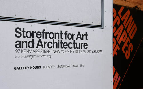 [Image: Outside-in: looking into Brian Slocum‘s panel installation (left) and Jeffrey Inaba’s/C-LAB’s temporary sidewalk pavilions, built from Tyvek and blown air, at Storefront for Art and Architecture; photo by Nicola Twilley].