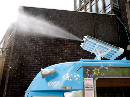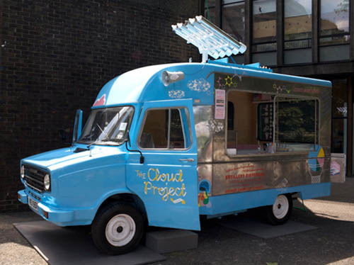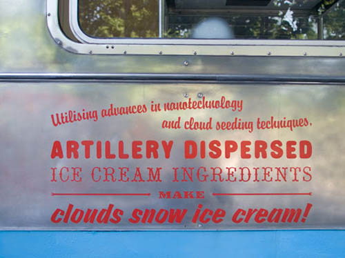 Like a whimsical hybrid of molecular gastronomy and Glacier/Island/Storm, the Cloud Project by Zoe Papadopoulou and Cathrine Kramer, design-interaction students at London’s Royal College of Art, would use “artillery dispersed ice cream ingredients,” fired from roof-mounted cannons, “to make clouds snow ice cream.”
