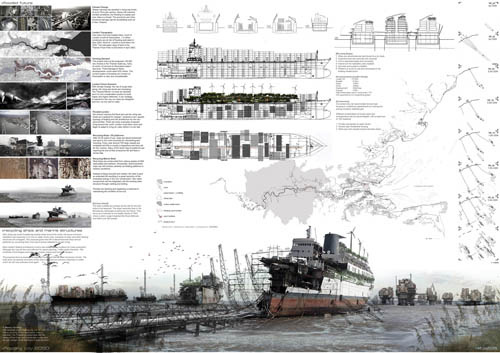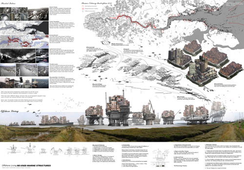 Continuing with a look at some noteworthy student projects—which kicked off this week with thesis work by Taylor Medlin—we now look at a proposal by Anthony Lau, submitted back in 2008 at the Bartlett School of Architecture in London. For that project, Lau designed a “floating city” for the Thames Estuary, ca. 2030 A.D. This “Thames Estuary Aquatic Urbanism,” as Lau refers to it, “gives new life to decommissioned ships and oil platforms by converting them into hybrid homes adapted for aquatic living.”