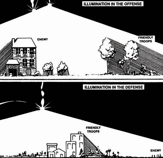 [Image: “Trip flares, flares, illumination from mortars and artillery, and spotlights (visible light or infrared) can be used to blind [the] enemy… or to artificially illuminate the battlefield,” from An Infantryman’s Guide to Combat in Built-Up Areas].