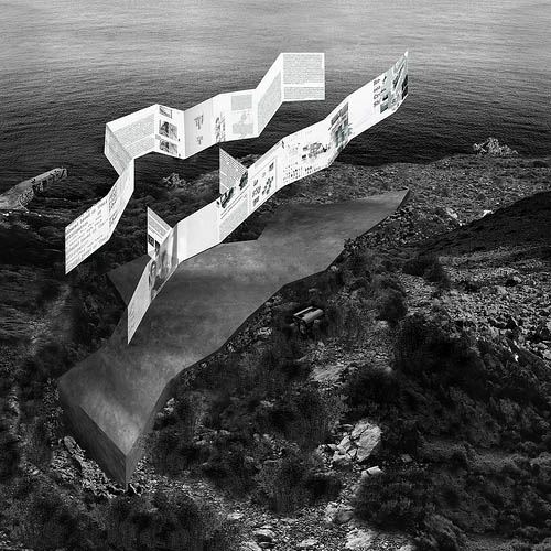 I’m more or less just randomly sampling his Flickr page, but “Screen Wall House” also deserves a quick look. Here, from what I can gather, a roofless island camping structure has the ability to expand indefinitely with the addition of further walls. “The walls that form this house are made out of screens,” Antonas writes. “These thin walls arrive by boat and are maintained by the desert place company, which is something similar to a camping set with particular rules. The screens can be added to existing concrete bases. A power engine provides the electricity that is needed for each unit.” The architecture, then, is dependent on the concrete floor plan laid out in advance by the “desert place company”—but one can easily imagine an alternative wall-structure that brings its modular floor plates along with it, thus allowing these flexi-mazes of temporary screens to encompass unprecedented interior spaces without a need for prior planning.