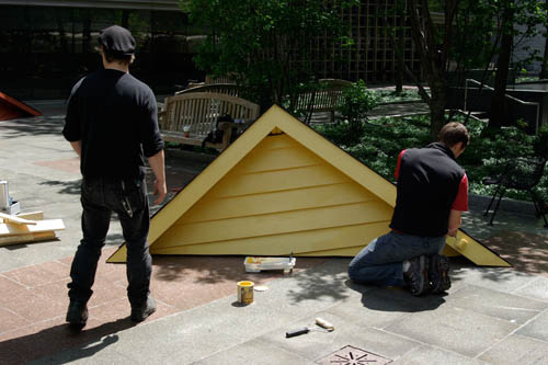 Taken too far in one direction, of course, this idea could very easily become a kind of postmodern joke—architectural theme-props for a children’s playground—but the installation manages to avoid explicit dramaturgy, its fragments more like Gordon Matta-Clark’s Building Cuts emerging from the surface of the city.