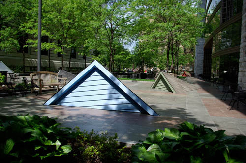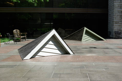 Watership Down creates a scenario where five houses are frozen for a moment in a process of complete submersion into the ground of the Eastman Garden. Placed throughout the Garden, the gables of these houses project out of the earth at various angles. These create focal points of interest within the garden and become follies to climb, sit and rest upon.