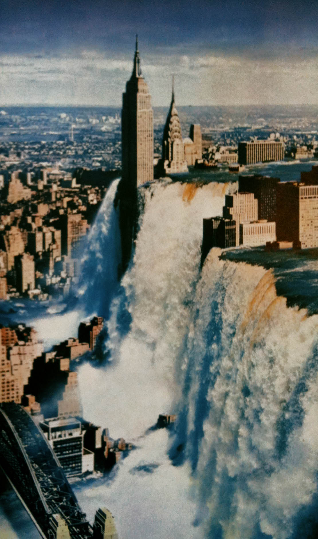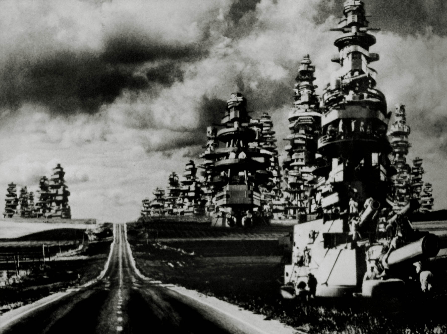 Waterfalls scour sublime new cliffsides from the architectural canyons of Manhattan; modern tower blocks pitch and yaw atop aircraft carriers at sea; battleship gun turrets are cloned and repeated into Baroque stupas—cathedrals of artillery—along the empty roads of agrarian landscapes. For my money, these latter structures outdo Hans Hollein’s Aircraft Carrier City in Landscape, with which they nonetheless share a certain tectonic similarity.
