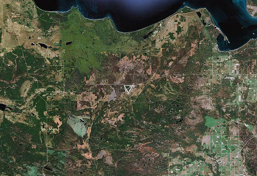 In the woods of northern Michigan, near Hiawatha National Forest, is a massive triangle, unnamed and unlabeled on Google Maps.