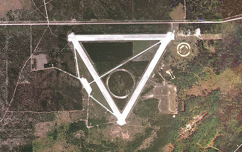 But, despite its anonymity (it even disappears from view altogether when you switch from “Satellite” to “Map“), this is not some underground HQ for a secretive cult of aerially-minded geoglyph-builders, and it’s not more scientological circles—it’s a former military base and landing-strip complex called Raco Army Airfield.