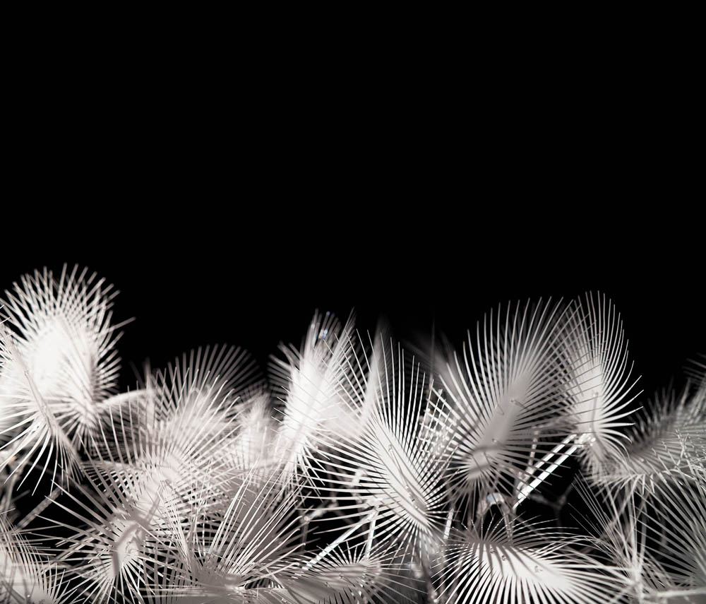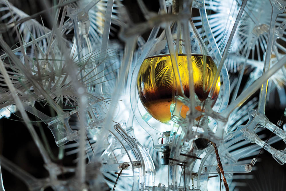 Part of this artificial life comes from the “intricate lattice of small transparent acrylic meshwork links” that make up the project, as well as the “network of interactive mechanical fronds, filters and whiskers” that form its periphery. Together, these allow the installation’s edges to “arch uncannily towards those who venture into its midst, reaching out to stroke and be stroked like the feather or fur or hair of some mysterious animal.”