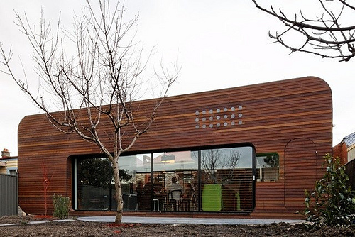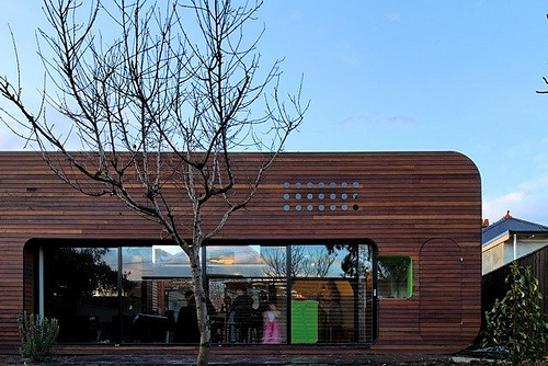 It’s more like a wooden object extruded from an industrial design seminar than what you might expect from a suburban home, and it’s also gloriously retro-colorful on the inside, with a lime green kitchen and pixellated red tiles in the bathroom.