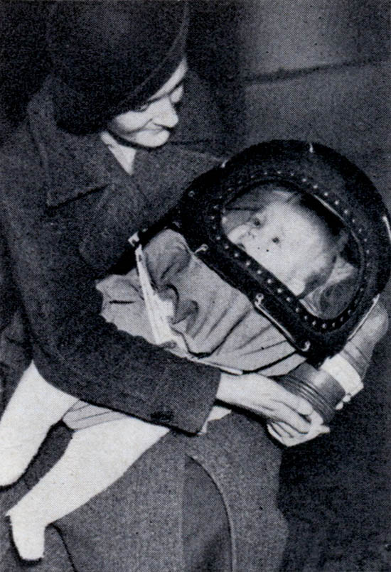 The 'Machine Boy' is in an infants gas mask produced in the UK during the second world war. As the breathing of a small child was insufficient to draw air through the charcoal filter the respirator required continual pumping, by the rubber bellows in the womans hands.