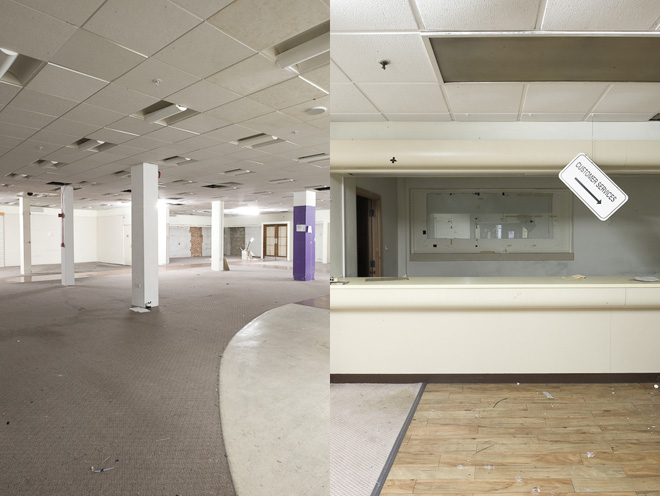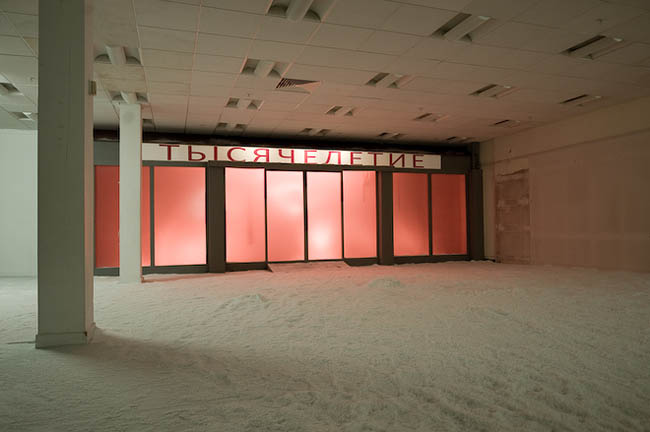 This takes on a somewhat mind-bending dimension when we learn that, in the fake department store (within the ruined department store…), attendees are confronted with architectural models “lent to the show by the architects Conran & Partners (so, interestingly, these models are for actual redevelopments that may someday be built).” That is, real buildings, constructed perhaps ten or more years from now, could someday be realistically interpreted as hypertrophied spatial aftereffects of this particular stage set.
