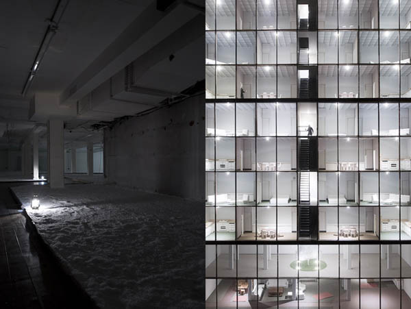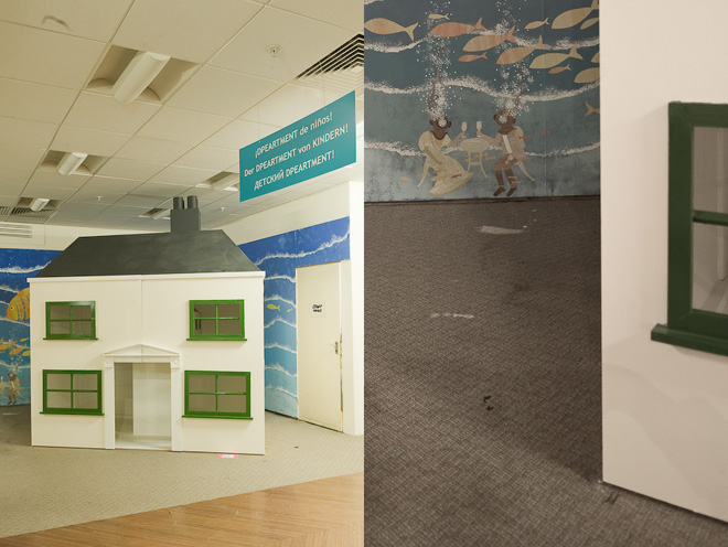 [Image: The “leaded windows… re-used with elaborate models of show apartments and odd and surreal rooms,” photographed by Jim Stephenson].