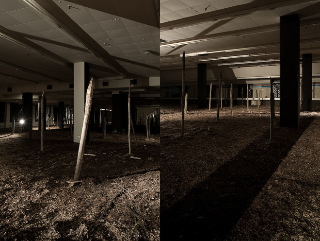 You’ll find that I’ve barely even begun to describe the set’s intricacy: there are internal CCTV networks covering the unfolding of the play, multi-lingual actors and actresses wandering through the scenes, and even a secret passageway through a department store cupboard. The final space, like the boss level of some massive new game, “is a huge room, almost an entire floor of the Co-Op,” Stephenson explains, “filled with the remains of a former orchard. A deforestation scene, with woodchips all over the floor and tree stumps left.”