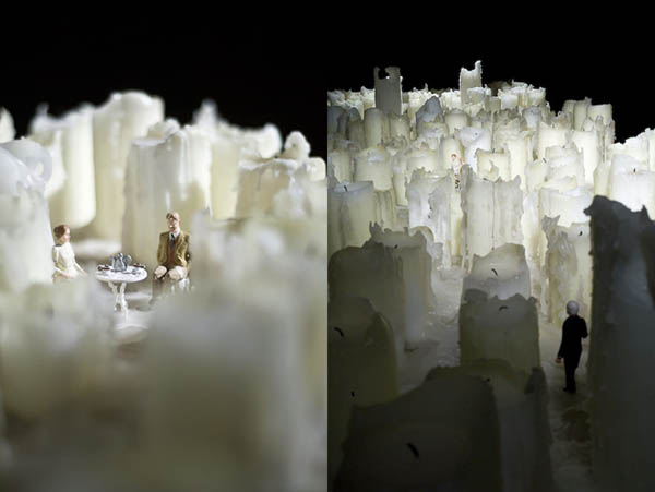 In one of the images below, for instance, Stephenson writes that we see a table “covered in a forest of formerly lit candles”—and within the melted wax, “models of the couple from earlier [in the play] sit drinking tea.” It’s microcosmic self-repetition—a kind of ontological splintering in architectural form.