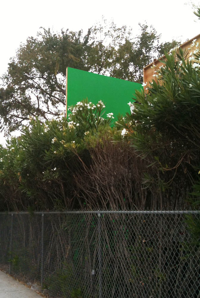 It’s the new urban Baroque! Install greenscreens everywhere in an optical infrastructure for the 21st century—a DIY industry of everyday special effects, little greenscreens popping up beside trees, in alleyways, behind buildings, atop roofs, the entire urban environment camera-ready and pierced like St. Sebastian by the arrows of parallel worlds, our cities become effects labs and every sidewalk a set.