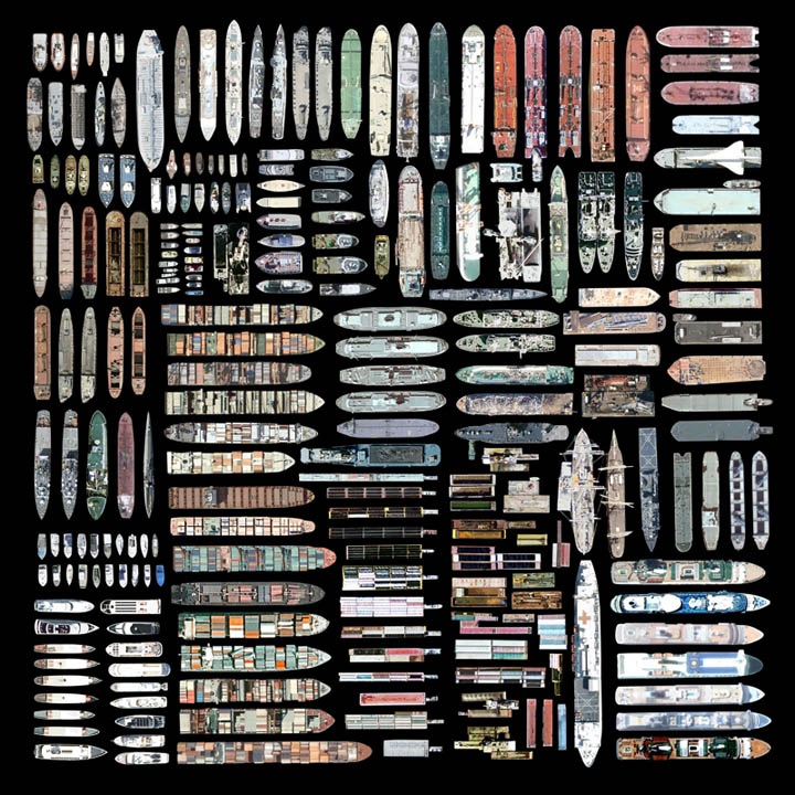 [Image: Oceangoing ships clipped and stitched from Google Maps by artist
