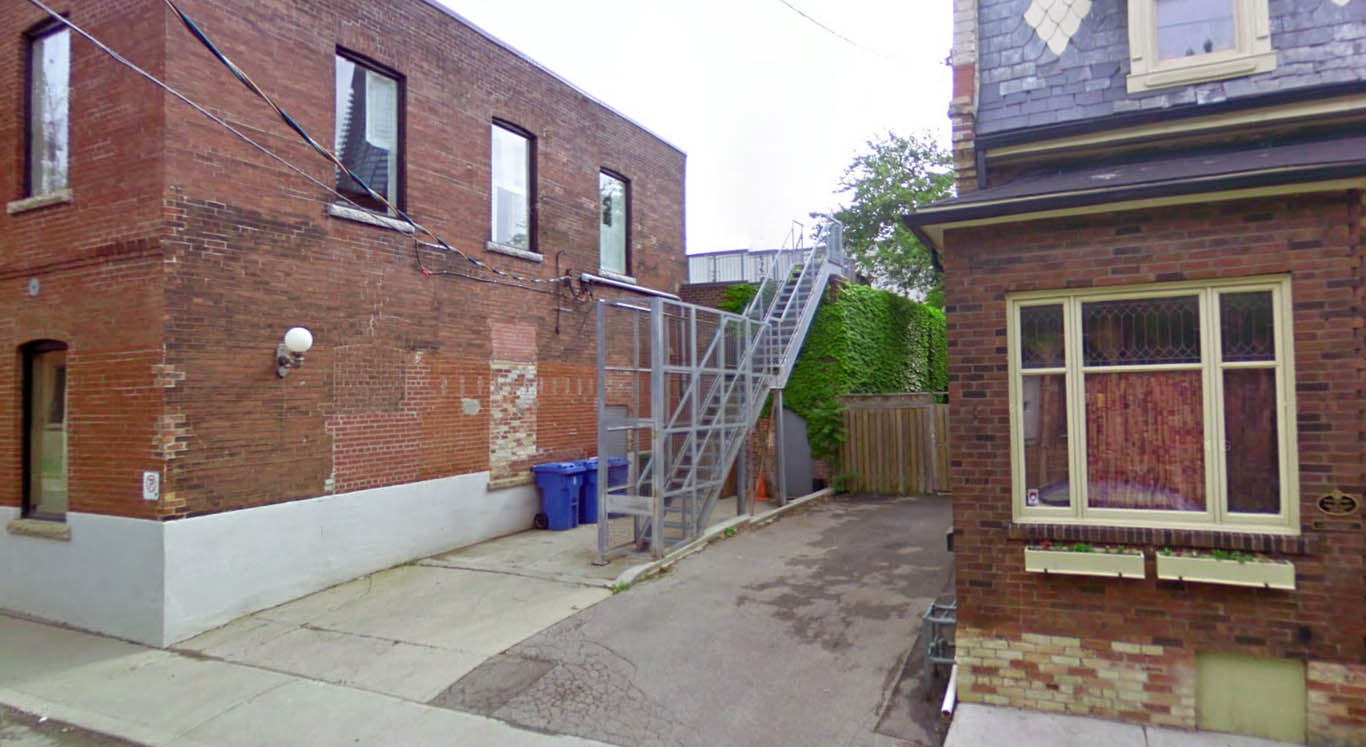 [Image: A fenced-off, back alley security stair in Toronto, via