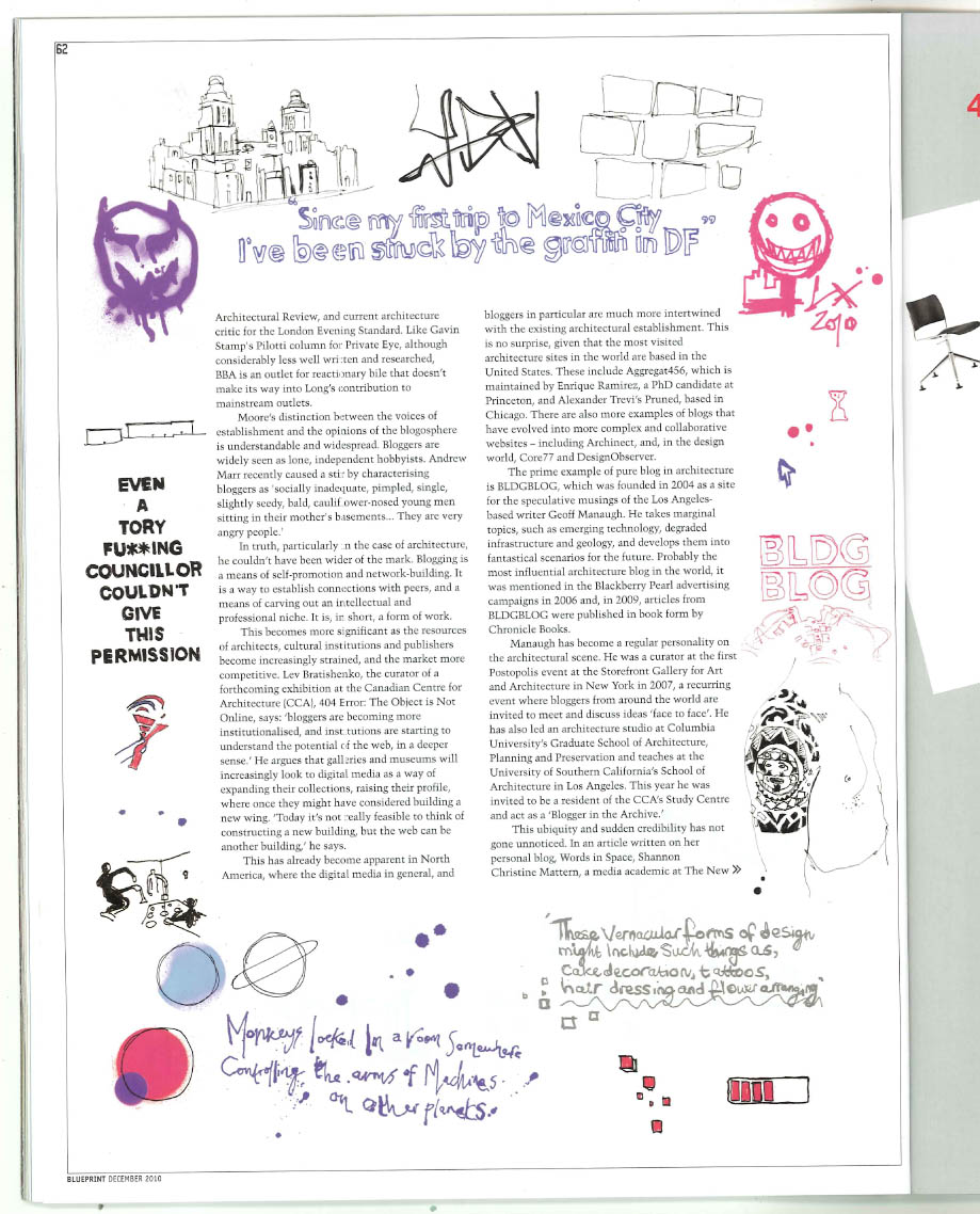 Do you think that getting you to write a response and generate interest in the article was part of the plan? This isn't the first shot taken at blogs by Blueprint or the dead tree mags – and they're mostly lacking in serious content. Like you said, claiming that BLDGBLOG and Things don't offer serious architecture criticism like we all know from our school days is like saying water is wet.