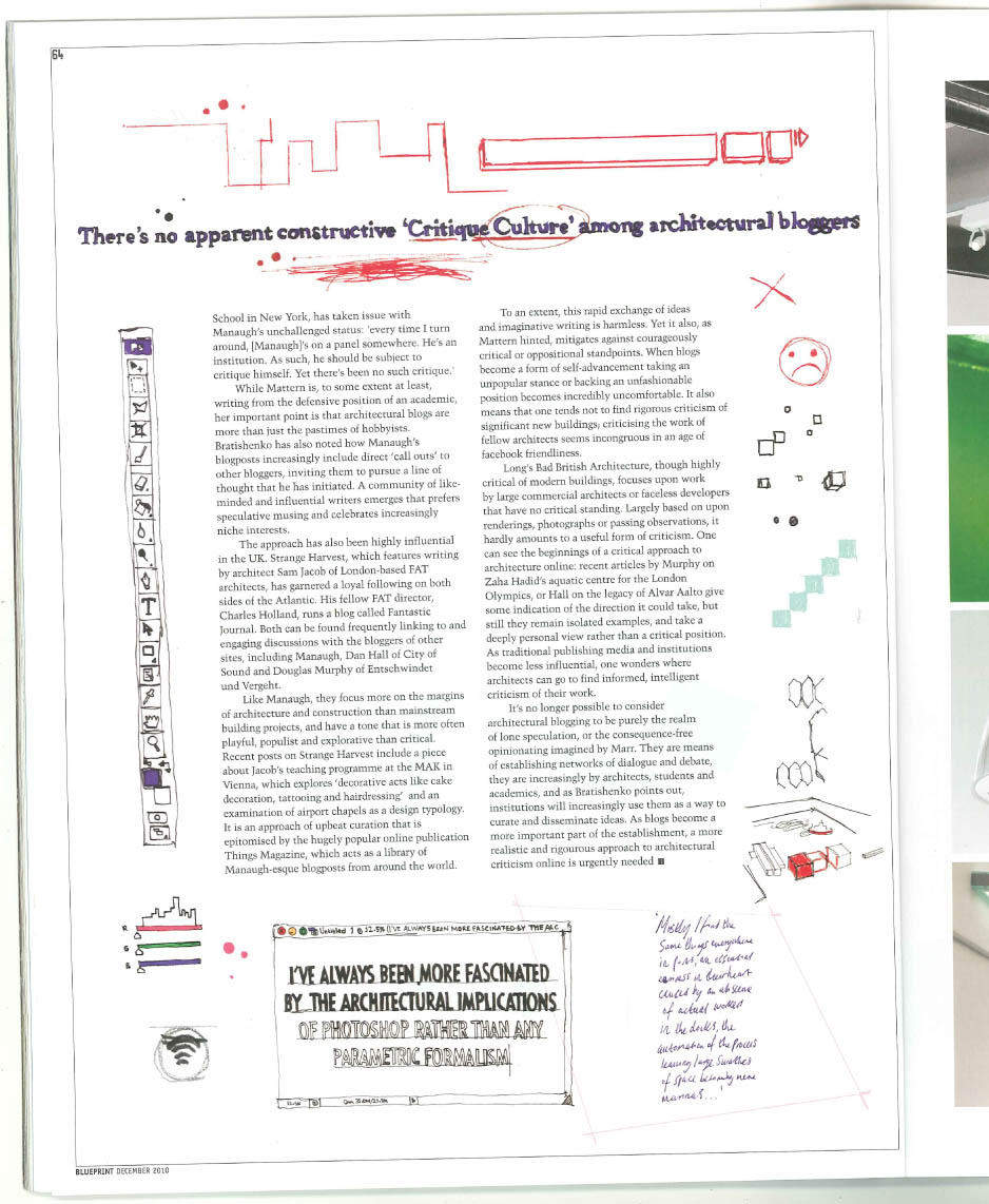 I think overall the article was less about the lack of critique, and more about inside/outside. He seems to have a problem with people who write blogs also being involved in the publishing industry, and in a way he has a point. It's difficult to argue that blogging is an egalitarian medium when so many of the more well-known architecture bloggers are either already well known as architects/writers, or have made their way into that world through their writing…