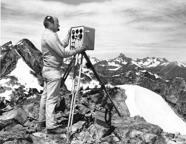 [Image: ”A crewman operates an Electrotape, circa late 1960s… a precise electronic surveying device that used microwaves to measure distance… It yielded centimeter accuracy over distances from 100 meters to 40 kilometers, and in all weather conditions, day and night. Two units were needed, one to send the signal and the other to receive it. A brass triangulation station marker is visible directly below the Electrotape.” Courtesy of the USGS].