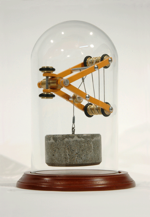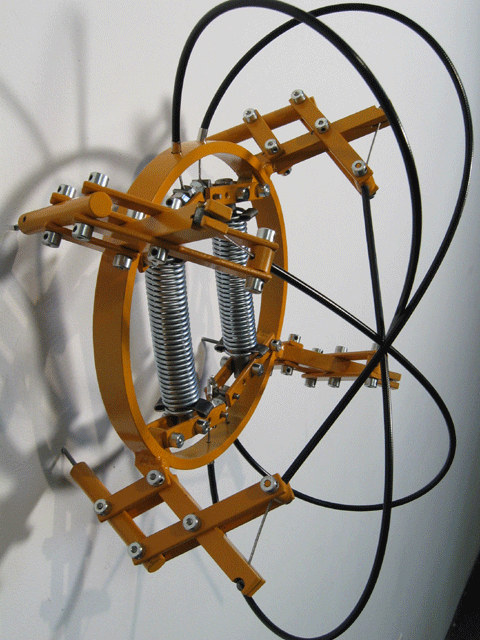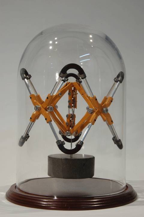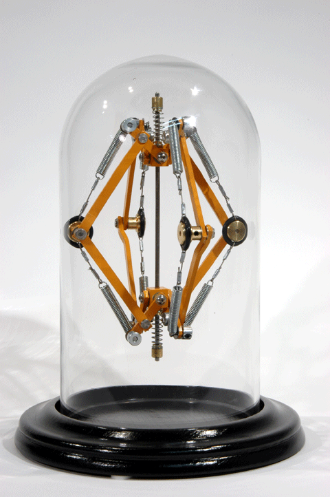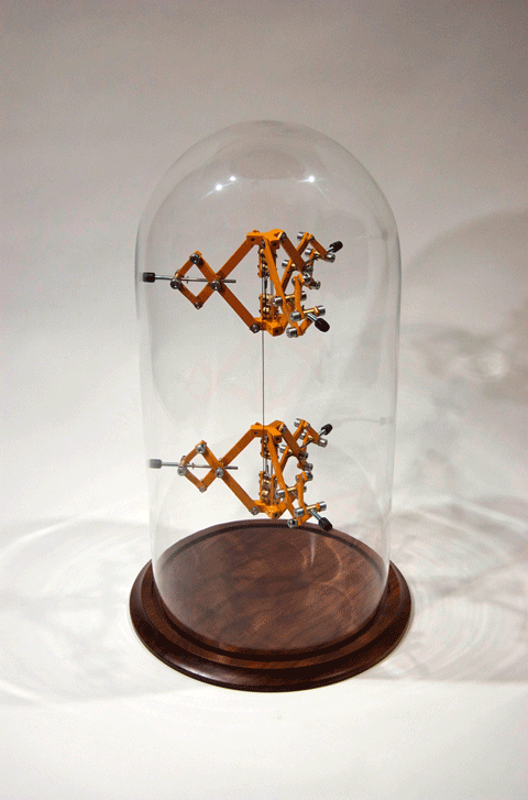 Grayber’s Cavity Mechanism #6 w/ Glass Dome, for instance, “is a pair of spring loaded mechanisms that wedge themselves into the inside of a cavity (the glass dome in this case), suspending themselves. Cable running between pair maintains tension on both mechanisms. If cable were to fail, both mechanisms would fall.”