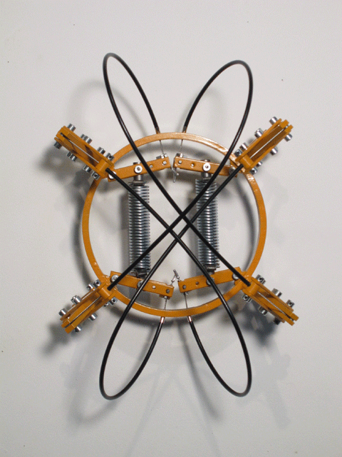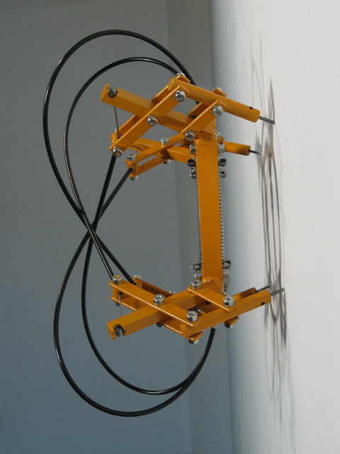 Removed from the glass vitrine and installed directly on a concrete wall, it “consists of central tensioning mechanisms and eight ‘satellite’ contact objects, in pairs. Tension created from central mechanism is run through pulleys on each pair of ‘satellite’ objects, pulling them together, creating tension that squeezes column and supports central piece.”