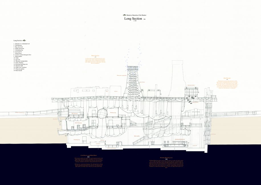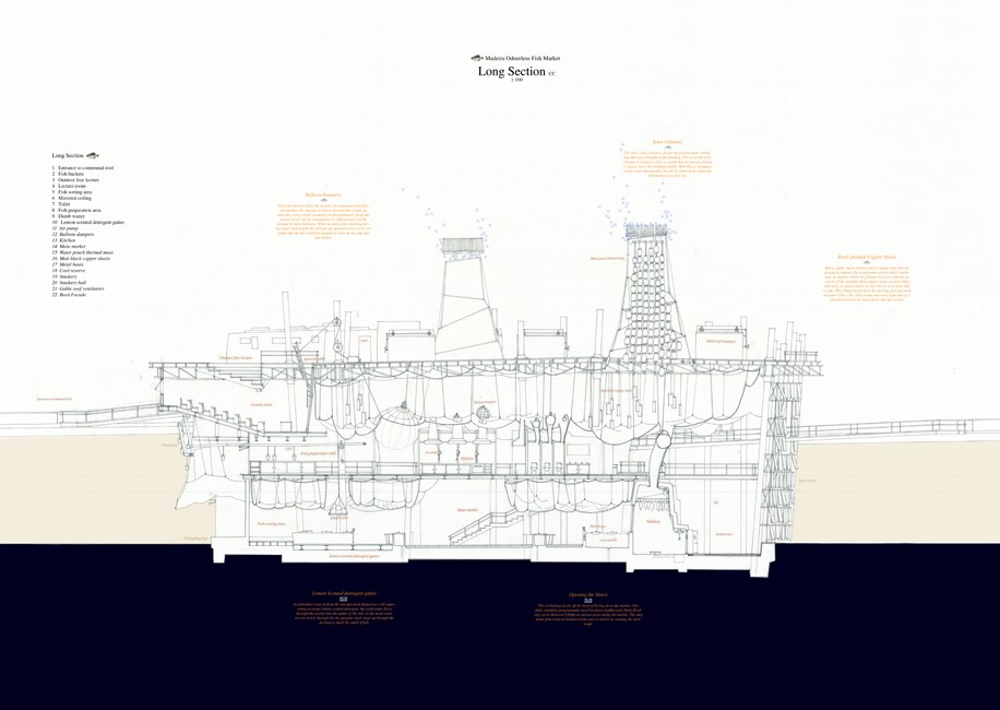 Accordingly, the Odorless Fish Market “provides a place where their catch can be sold directly. The programme consists of a fish market, smokery, fish cookery school cum restaurant run by the fishermen community. Its architecture is technically driven to control Smell, Ventilation and Cooling, to provide a building with a greatly reduced smell of fish. The heart of the architecture is a solar chimney system which uses the consistent madeiran sun to, ironically, ventilate/cool the building.”