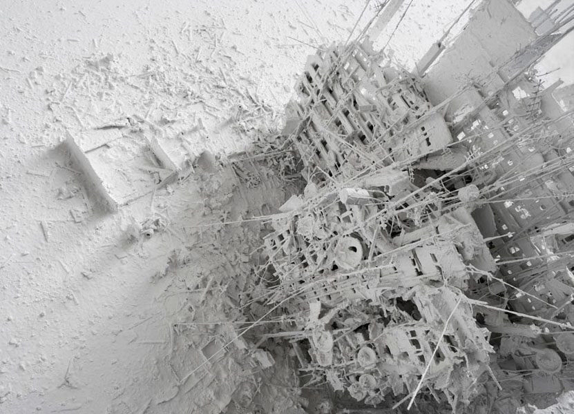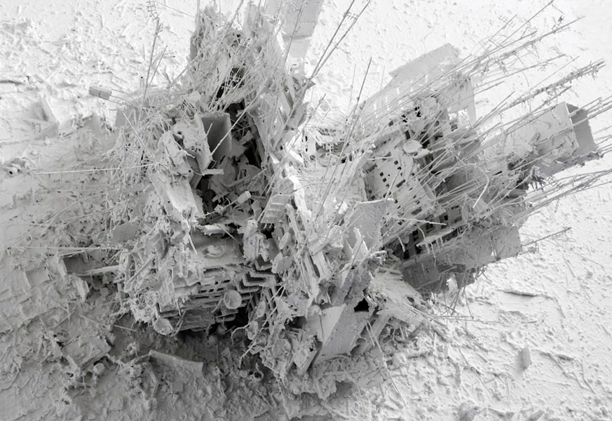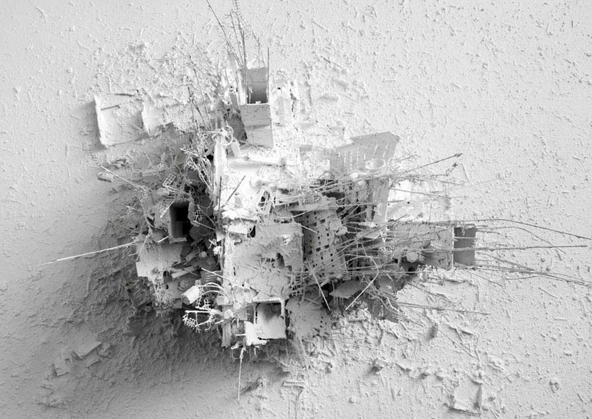 They are perhaps what a tectonic collaboration between Lebbeus Woods and Jackson Pollock might produce: blasted and collapsing landscapes so covered in white it’s as if nuclear winter has set in.