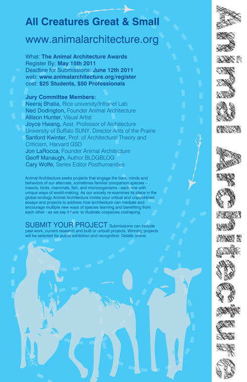 Further information—including the names of the editorial jury, which features Sanford Kwinter, Joyce Hwang, Neeraj Bhatia from InfraNet Lab, myself, and many others—can be found on the Animal Architecture website.
