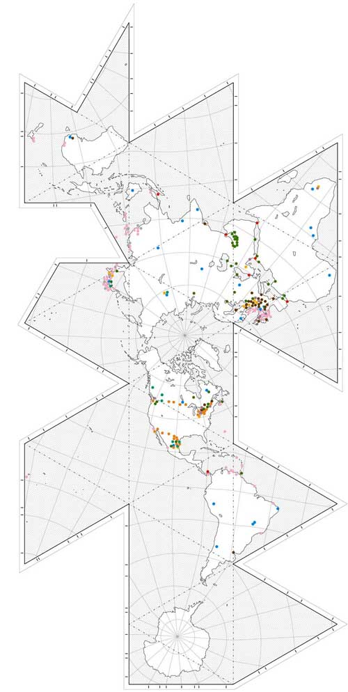 [Image: Map by, and courtesy of, Domus, “in homage to Buckminster Fuller’s famous Dymaxion projection, and showing the locations of 259 critical infrastructures”; see it folded up, courtesy of David M.A.].
