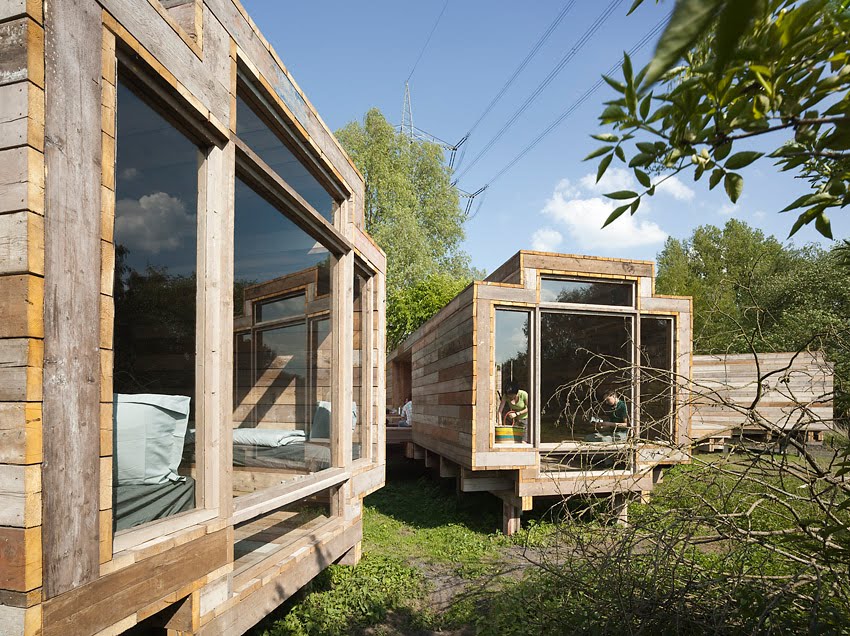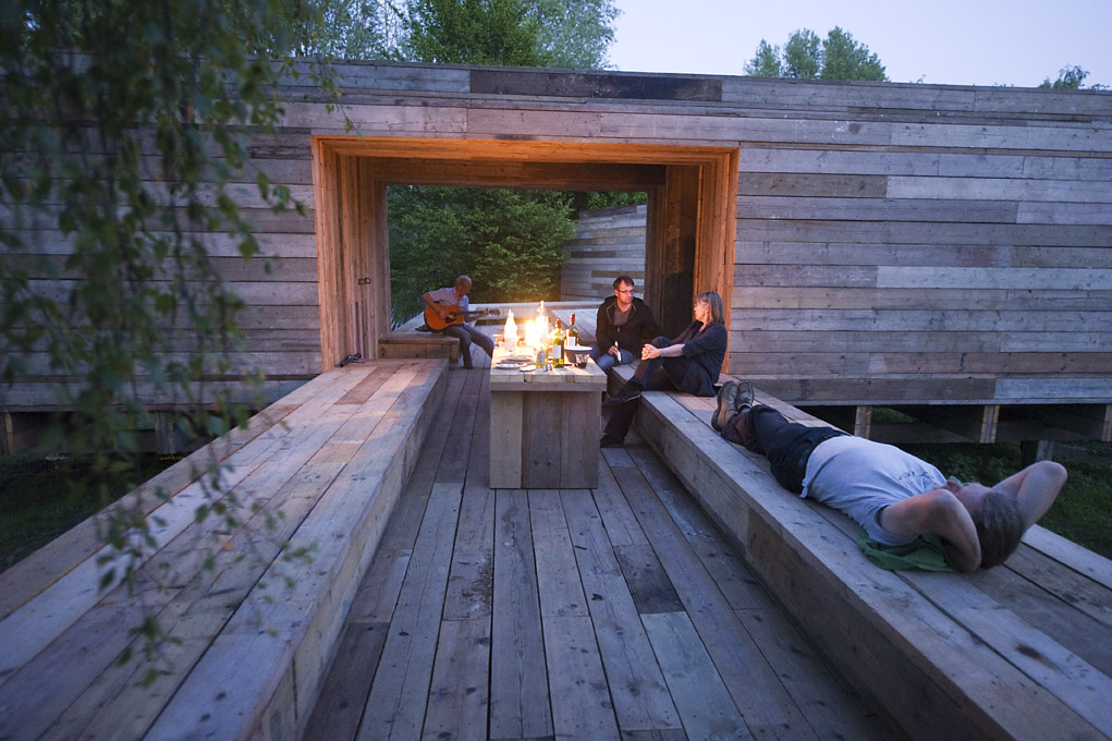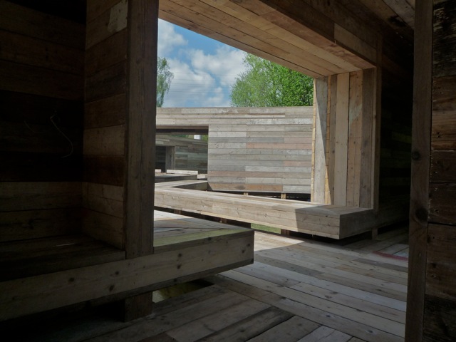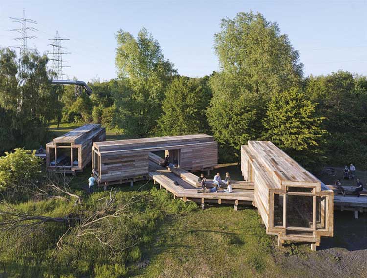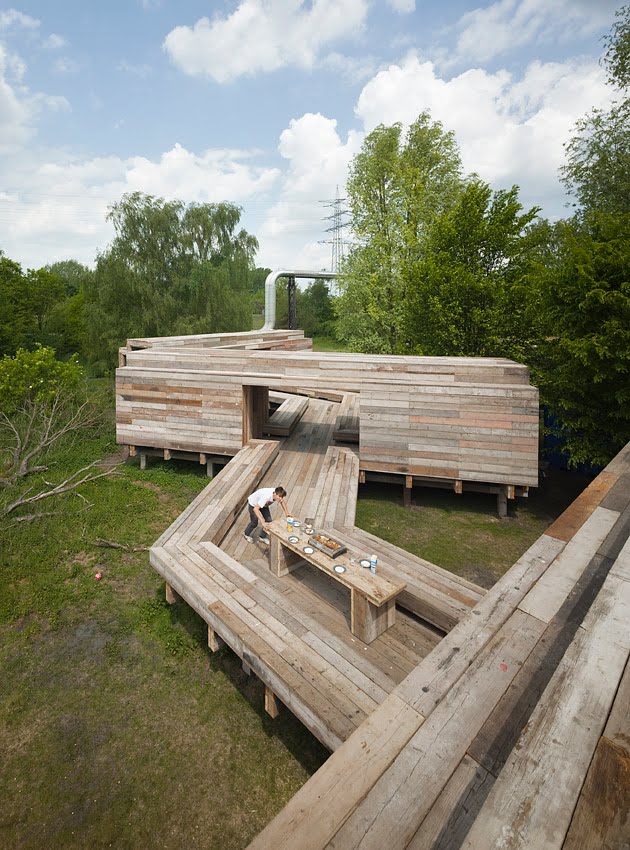 As the Art & Architecture Journal Press puts it, the project, made from reclaimed timbers, “sits over the waste land that will be the site of pastoral landscape in ten years time.”