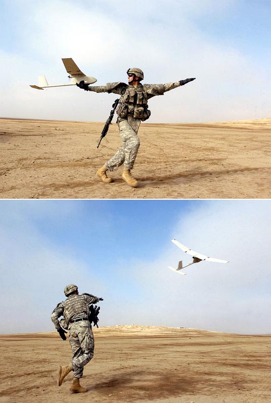 [Images: The Raven throw-drone by AeroVironment, photos courtesy of the U.S. military via Wikipedia].