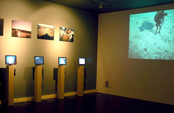 [Images: An installation shot from On the Farm: Live Stock Footage by Livestock at CLUI].