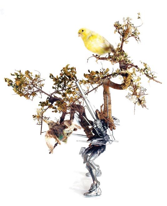 Young has written that, “as we stalk the strange and unfamiliar landscapes of robotics, biotechnology and ubiquitous computing, we are beginning to encounter a new form of engineered nature that we are not yet able to categorize.” His taxidermied hybrids thus populate these landscapes, arriving somewhere between technical objects—invented not evolved—and wondrous new organisms, monstrous yet beautiful in their singularity.