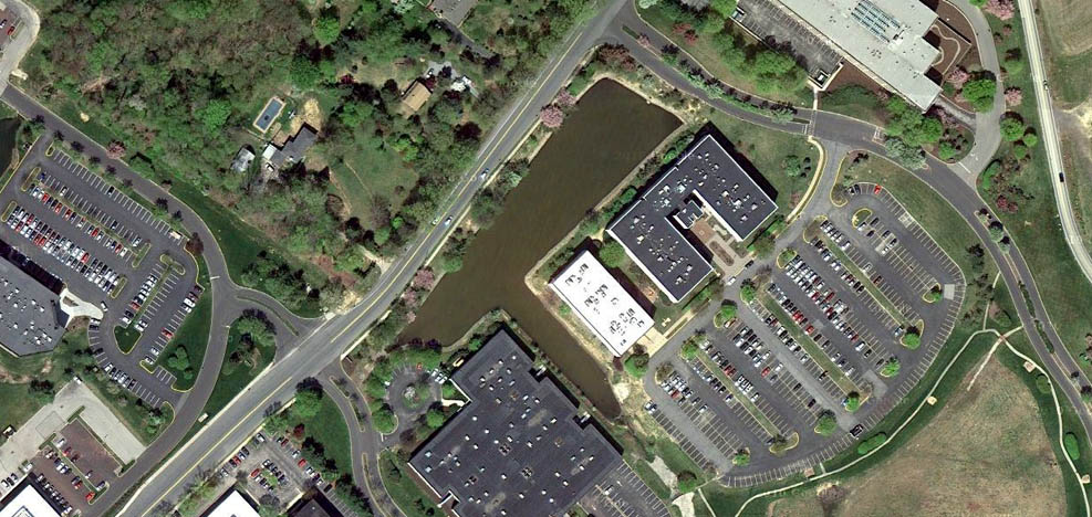 [Image: A satellite view of the corporate water feature become roadway hazard thanks to a landscaping crew in Blue Bell, Pennsylvania].